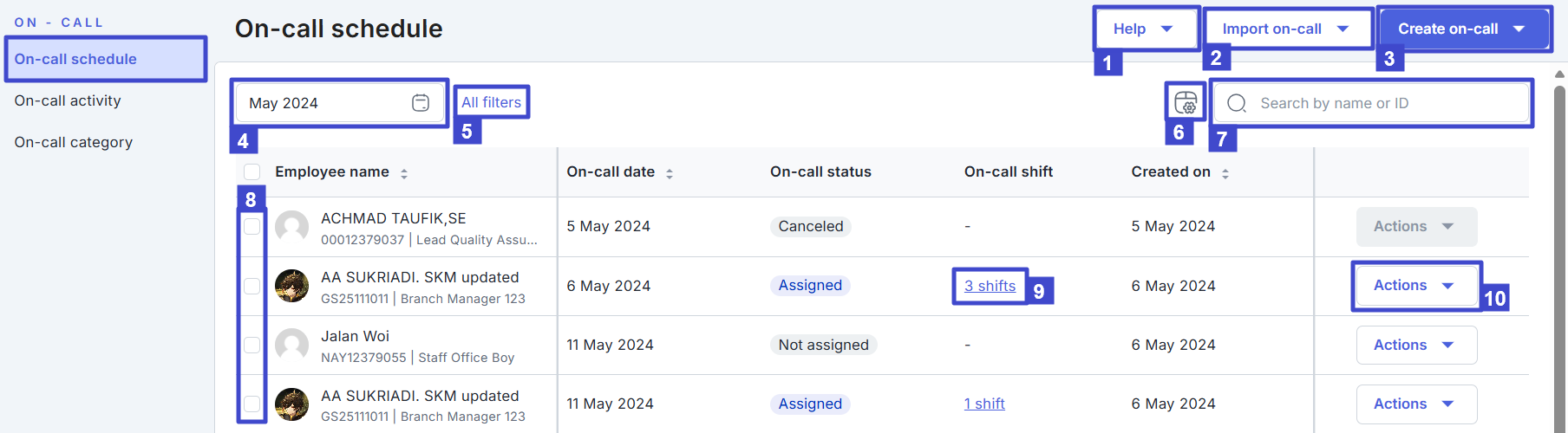Keterangan:No. Nama Tombol/Kolom Deskripsi 1 Help Klik untuk membuka panduan ini. 2 Import on-call Klik untuk membuat on-call schedule secara massal dengan mengunduh dan mengunggah spreadsheet. 3 Create on-call Klik untuk membuat on-call schedule secara satuan. 4 Filter periode waktu Klik untuk memilih jangka waktu data schedule yang tertera dalam daftar. 5 All filters Klik untuk memfilter data schedule berdasarkan tipe tertentu, seperti Branch, Organization, Job position, Job level, atau Employment status. 6 Adjust column Klik untuk menyesuaikan kolom yang ditampilkan pada daftar. 7 Search bar Klik untuk mencari data karyawan berdasarkan nama atau IDnya. 8 Checkboxes Klik checkbox di samping nama karyawan untuk melakukan tindakan massal Cancel on-call. 9 Shift detail Arahkan kursor ke sini untuk memunculkan rincian shift. 10 Actions Klik untuk melakukan tindakan Assign on-call shift (Menugaskan on-call shift), Remove on-call shift (Menghapus on-call shift), atau Cancel on-call (Membatalkan on-call shift).