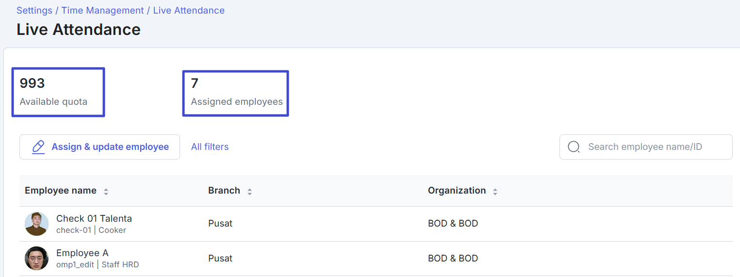 Di halaman ini, Anda dapat melihat total kuota yang tersedia dan karyawan yang sudah di assign live tracking.