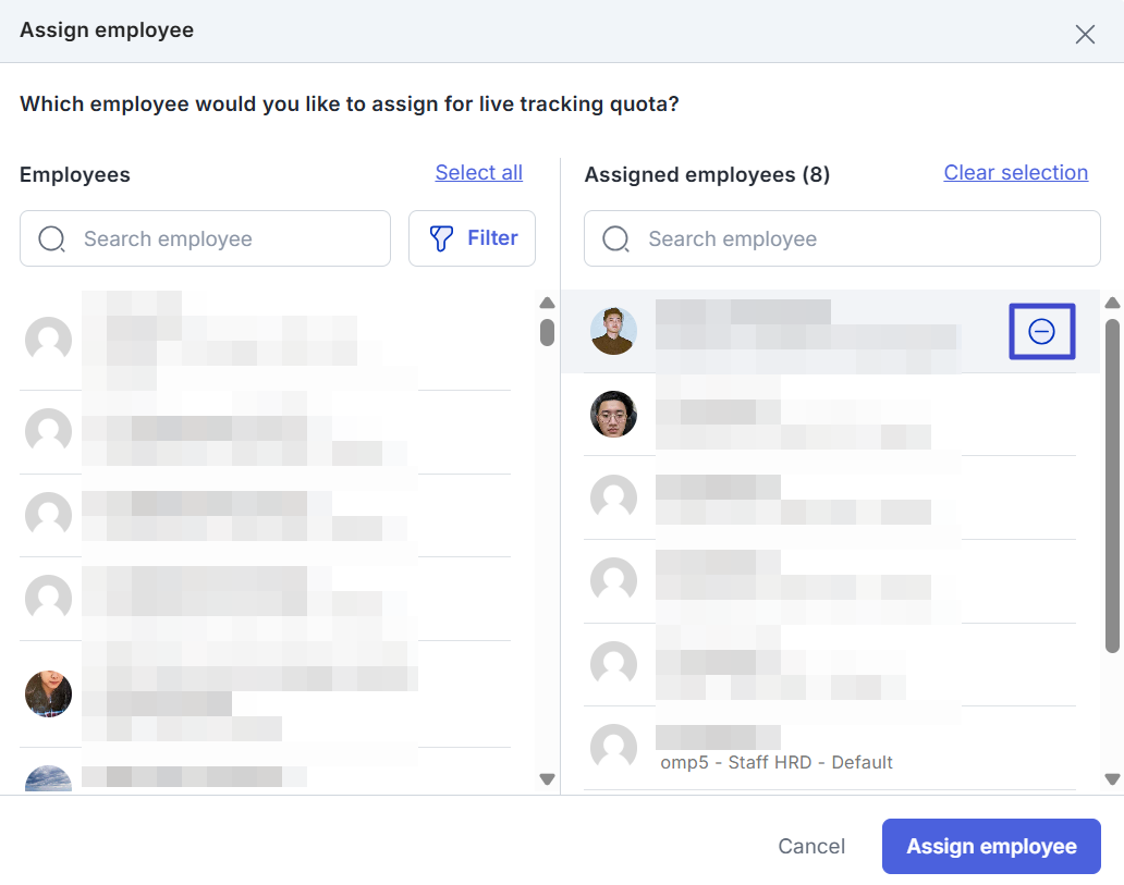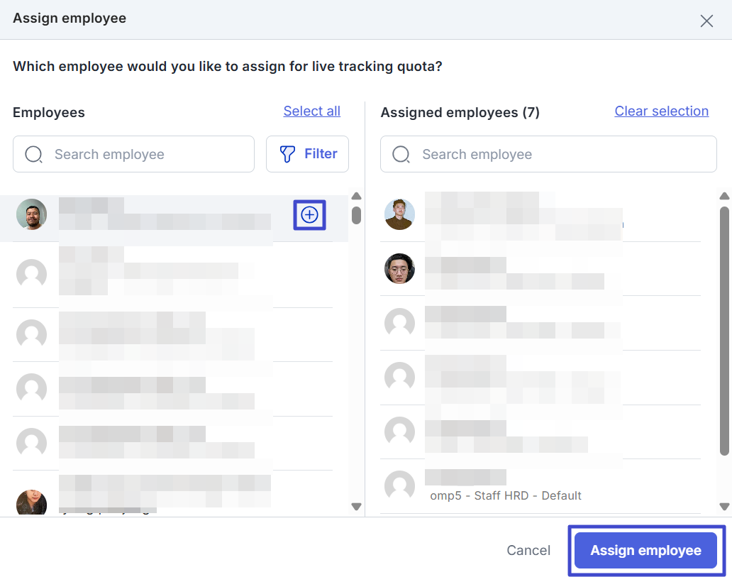 Klik “Assign & update employee” untuk memilih karyawan yang akan diterapkan live tracking.
