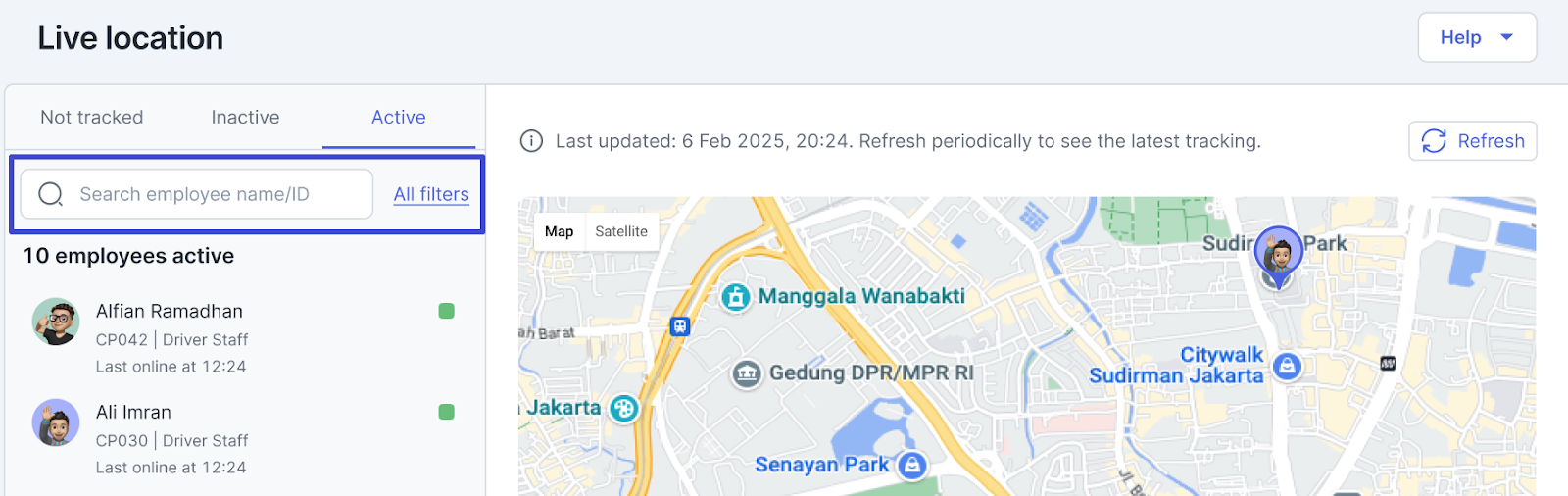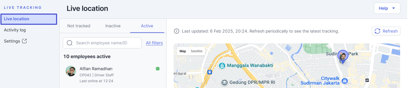 Misalnya, Anda memilih tab Active. Maka Anda akan melihat daftar karyawan yang sedang aktif, beserta lokasinya pada maps.