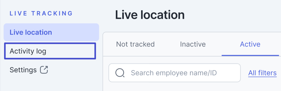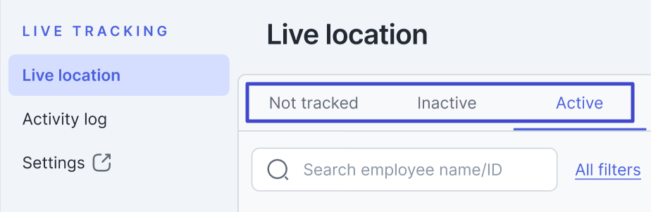 Di sini Anda akan melihat tab Not tracked yang berisi daftar karyawan yang belum memulai live tracking pada aplikasi Talenta, Inactive karyawan yang perangkatnya dalam kondisi tidak aktif dan Active berisi daftar karyawan yang live tracking-nya sedang aktif.