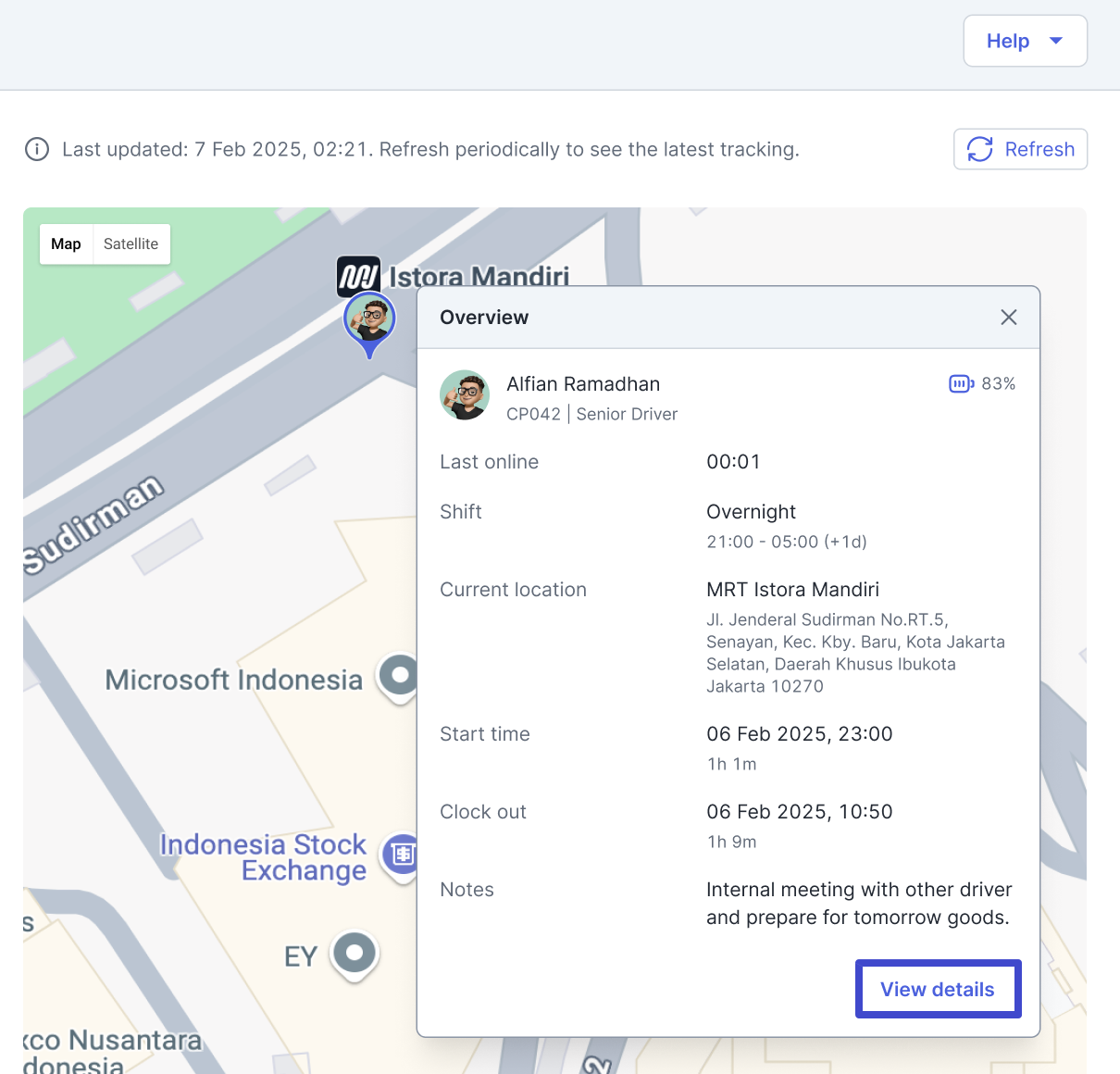 Dan informasi lokasi mengenai karyawan tersebut akan terlihat seperti ini. Anda dapat klik “View details” untuk melihat riwayat perjalanan karyawan tersebut.