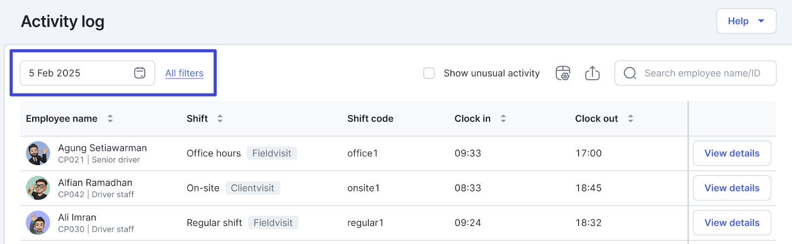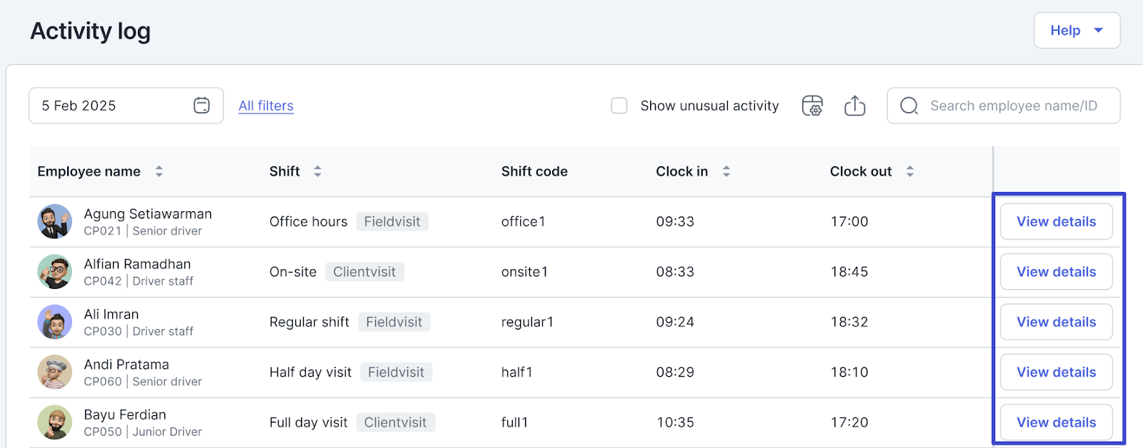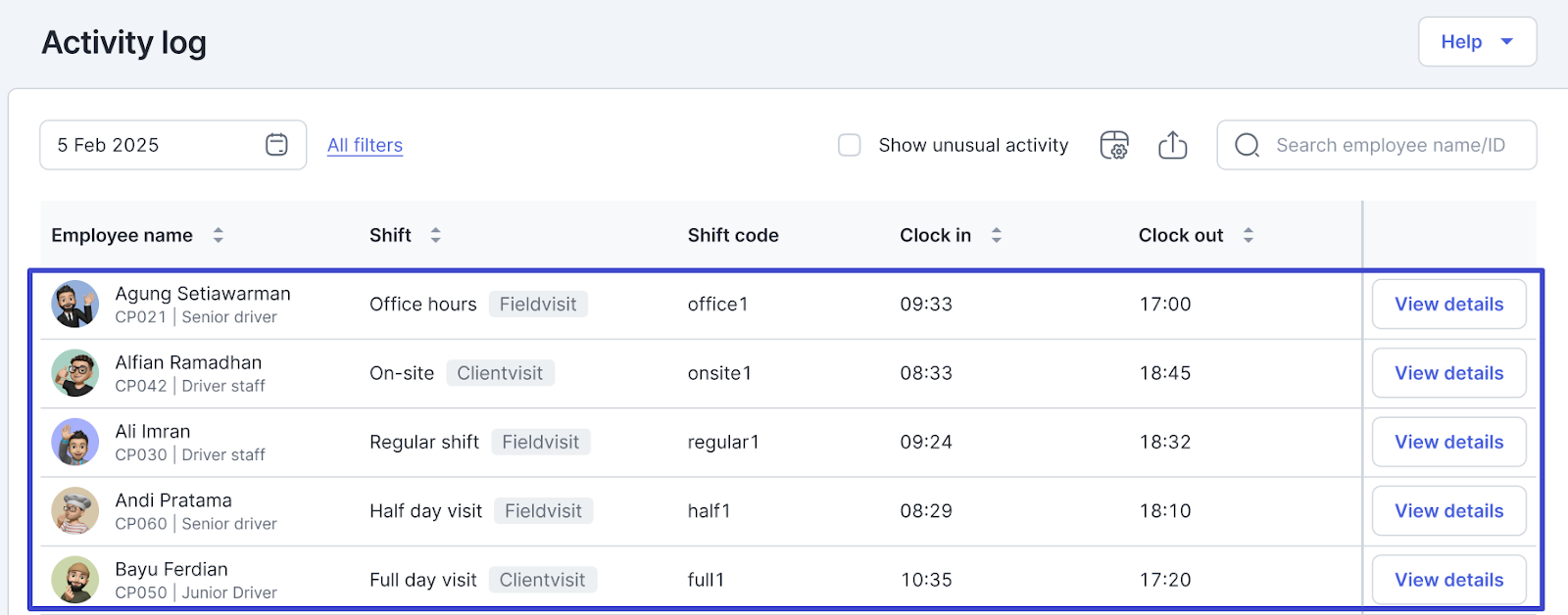 Di sini, Anda dapat melihat daftar karyawan beserta activity log yang dapat Anda lihat.