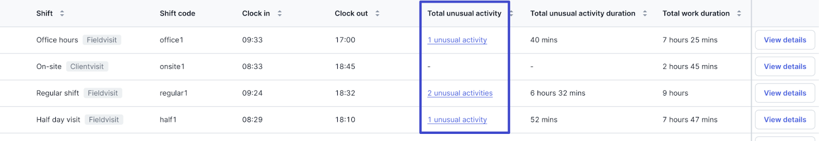 Jika Anda menggeser ke arah samping, maka Anda dapat melihat aktivitas tidak wajar dari karyawan pada kolom Total unusual activity.