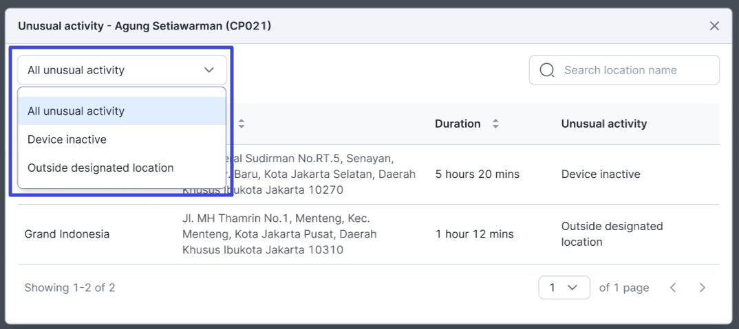 Pada bagian ini, terdapat 2 kategori aktivitas tidak wajar seperti perangkat karyawan tidak aktif dan karyawan berada di luar lokasi yang ditentukan.