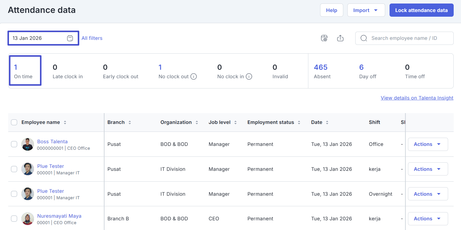Pada halaman ini, Anda dapat melihat daftar karyawan beserta detail attendance dan shift yang di-assign kepadanya.