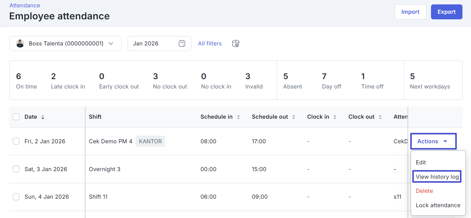 - Next workdays: Total hari kerja karyawan yang perlu dipenuhi selanjutnya (tidak termasuk cuti/time off). Untuk melihat riwayat kehadiran pada tanggal tertentu, klik tombol “Actions” lalu pilih “View history log”.