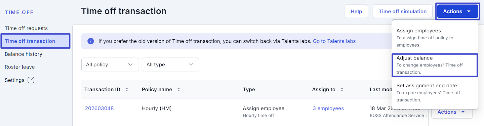 Buka halaman Time off transaction. Klik “Actions”, kemudian pilih Adjust balance.