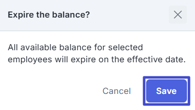 Pada pop-up yang muncul, klik “Save” untuk mengonfirmasi penerapan tanggal kedaluwarsa kebijakan cuti yang ditetapkan.