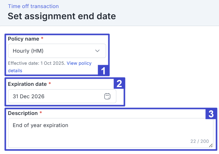 | 1. | Policy name | Pilih jenis kebijakan cuti. Anda dapat melihat tanggal efektif kebijakan tersebut di bawah kolom. |