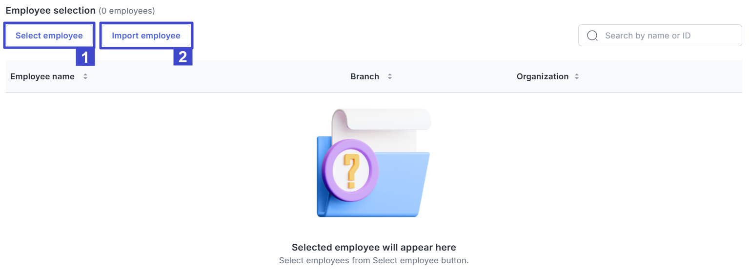 | 1. | Select employee | Tandai nama-nama karyawan di kolom kiri agar muncul di kolom kanan sebagai pilihan. Kemudian, konfirmasi dengan klik “Select employee”. |
