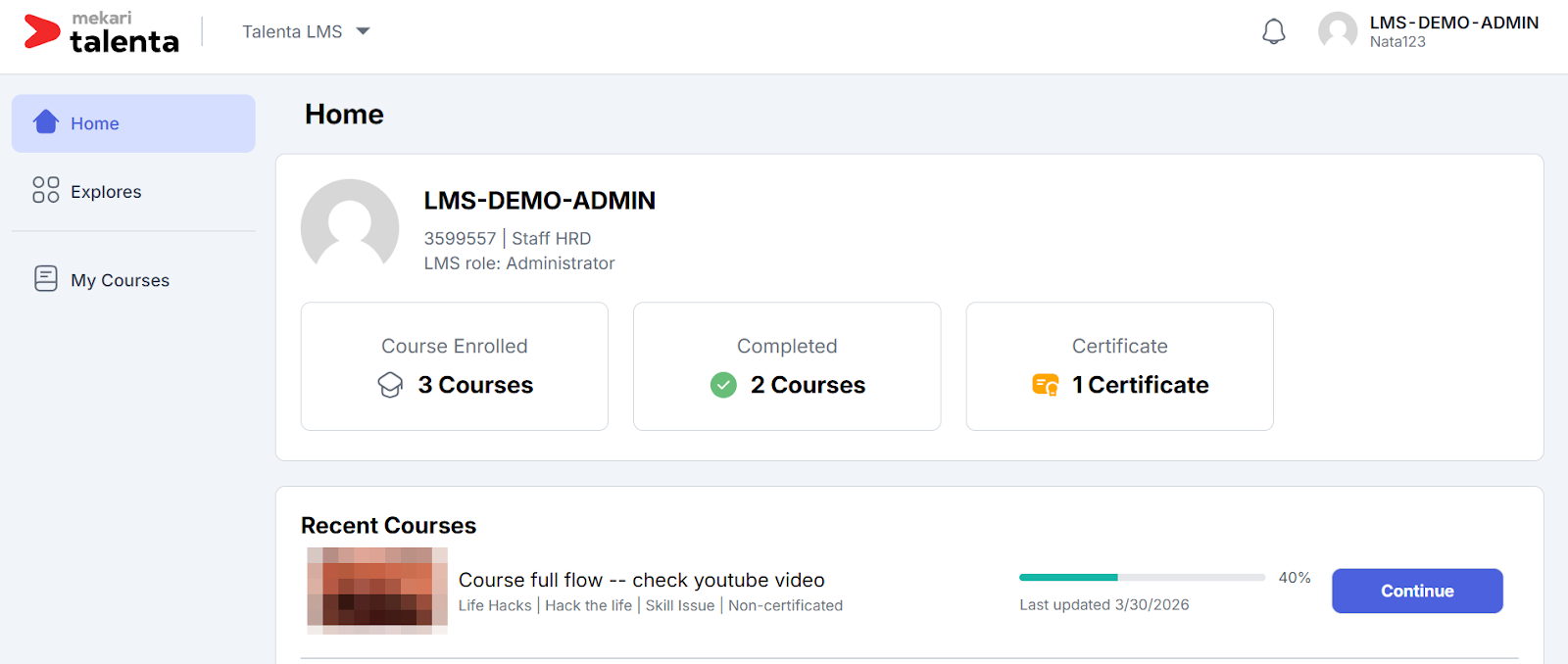 LMS Backyard merupakan halaman khusus yang digunakan oleh administrator untuk mengelola seluruh aktivitas pembelajaran di Talenta LMS. Melalui LMS Backyard, administrator dapat membuat, mengatur, dan menerbitkan course, serta mengelola seluruh komponen pembelajaran seperti kategori, level, konten, hingga assessment.