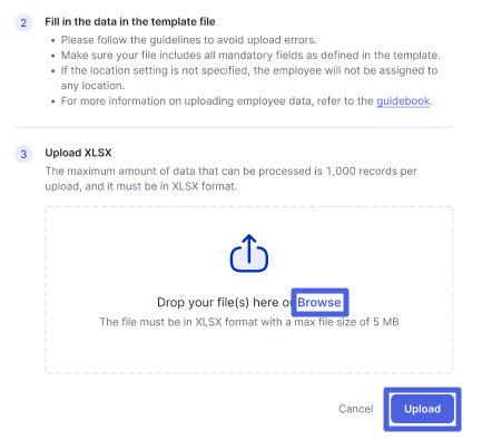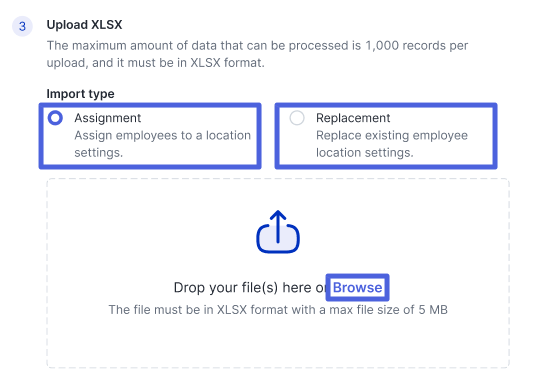 Apabila Super Admin mengaktifkan fitur multiple location setting, sebelum mengunggah file, Anda dapat memilih salah satu Import type sebelum klik “Browse”.